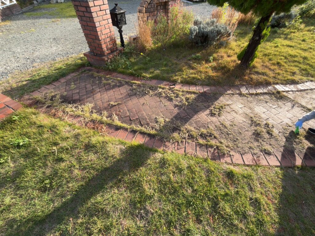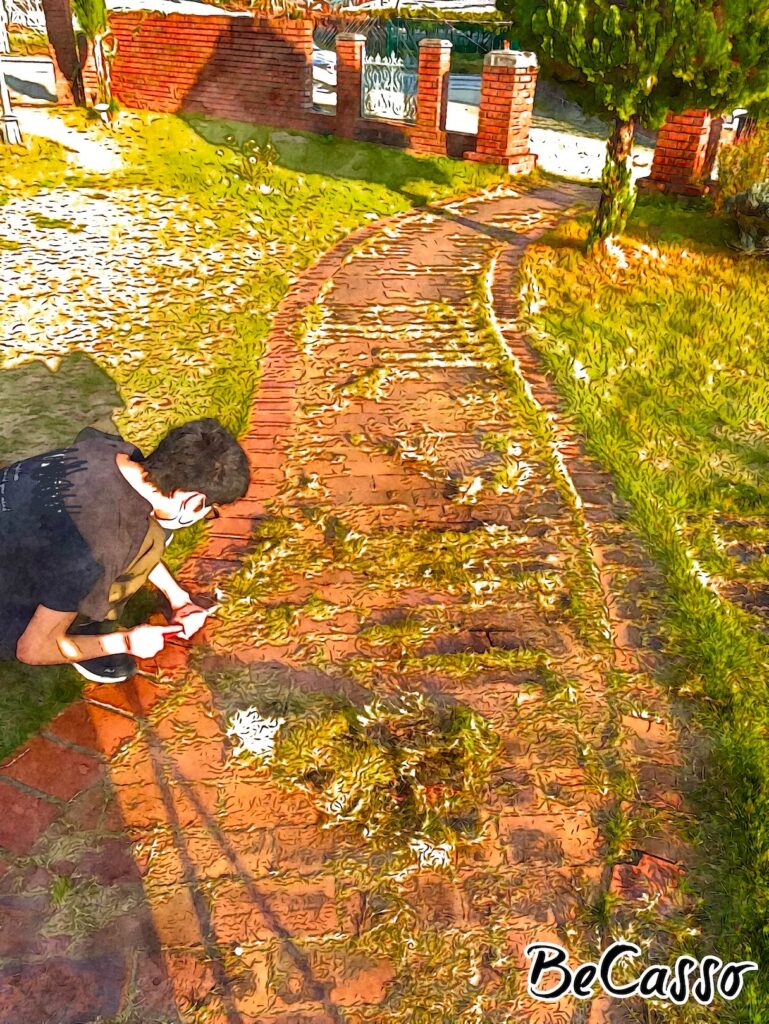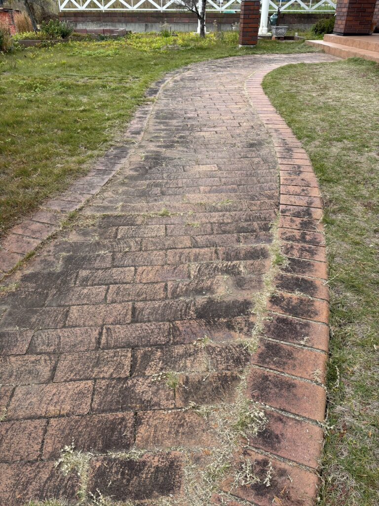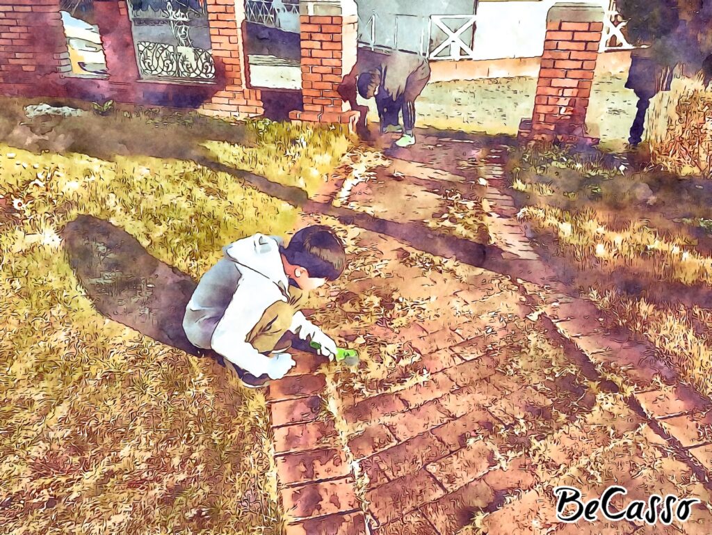 レンガの隙間からも芝が出てきてしまっているので、子どもたちにも協力してもらい、